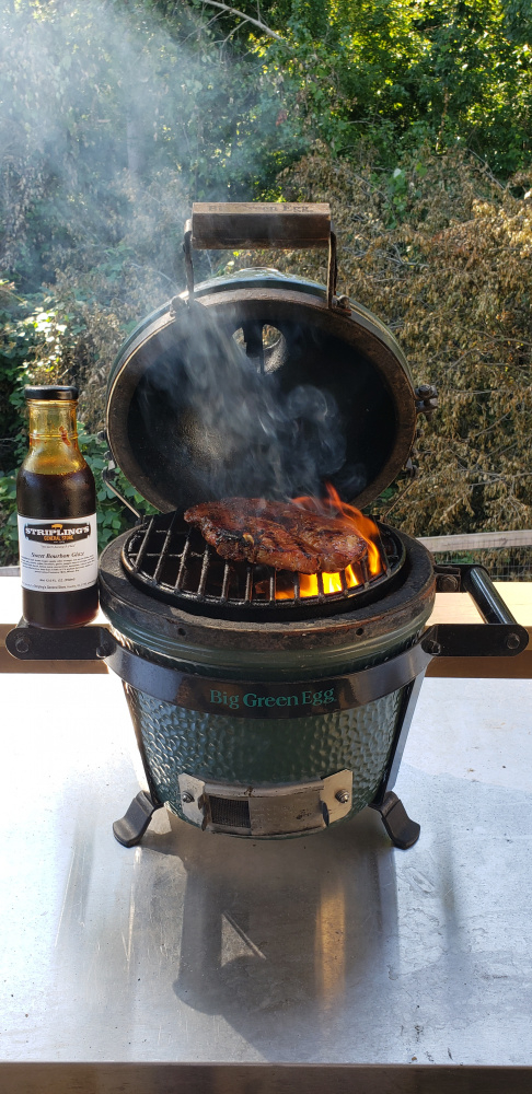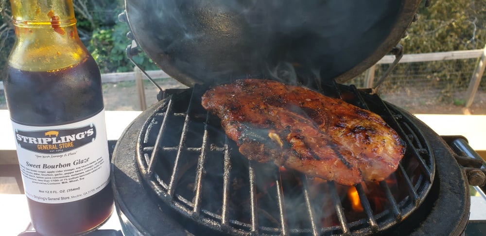 My neighbors gifted me with a sweet bourbon glaze from Stripling's General Store near Athens, GA. Marinated a pork chop in it for about 45 minutes before throwing it on the mini. Good eats on a Monday night!