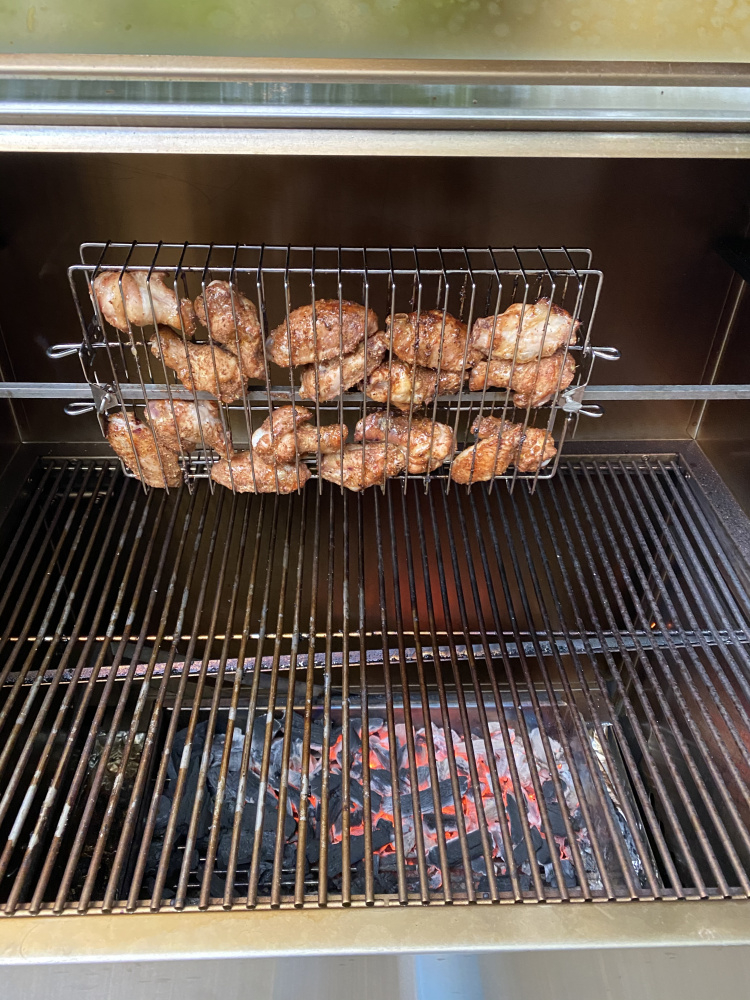 It’s flats and blue cheese for me. No time to cook today, so I will humbly post a pick of a prior cook on the rotisserie my wife gave me last Christmas