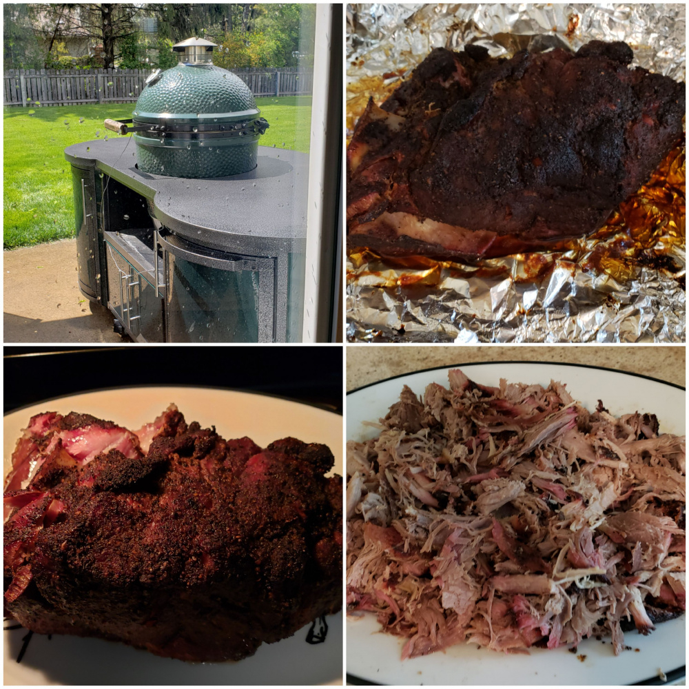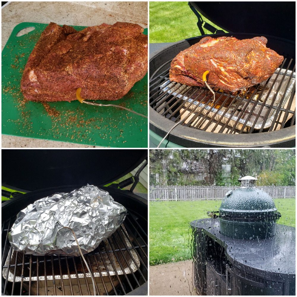 Prepped a pork butt with bourbon barrel aged maple syrup then applied shigs in pit bbq rub. Put on the egg running at 325. Wrapped it in aluminum foil when it hit 165. Perfect timing since it started raining as I retreated inside.