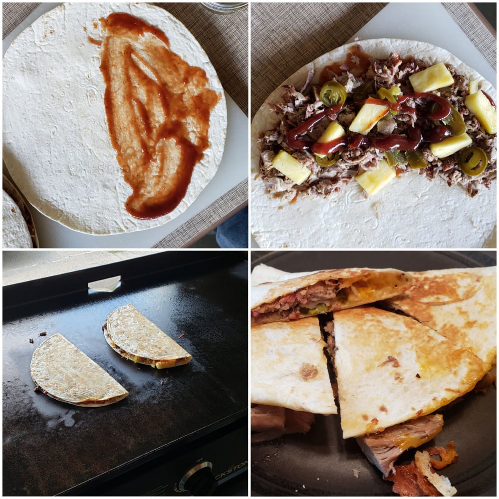 Once the pork was ready and my griddle was hot I assembled my prize. Tortilla with shigs in pit bbq sauce, pulled pork, jalapenos, pineapple cheddar cheese then toasted.
