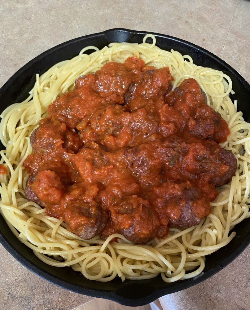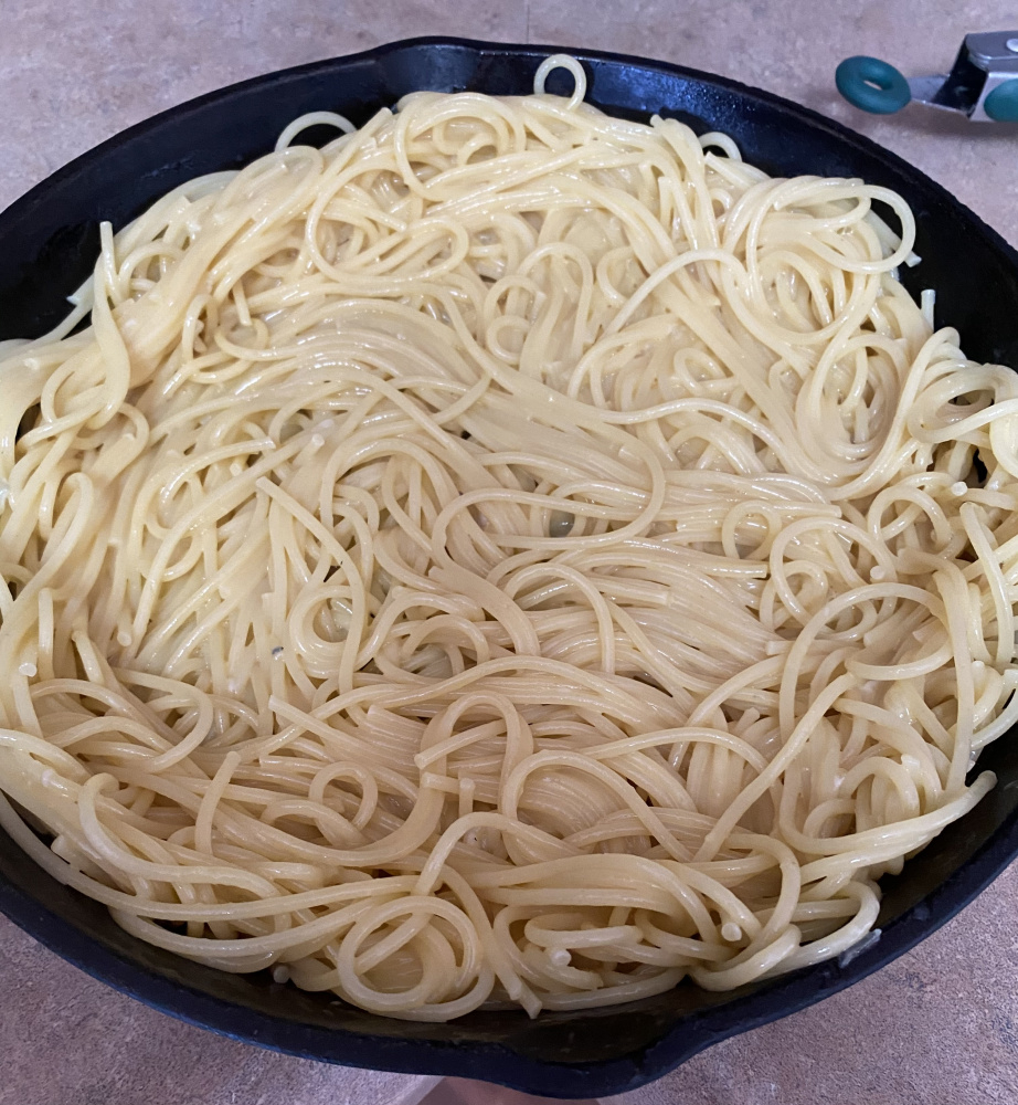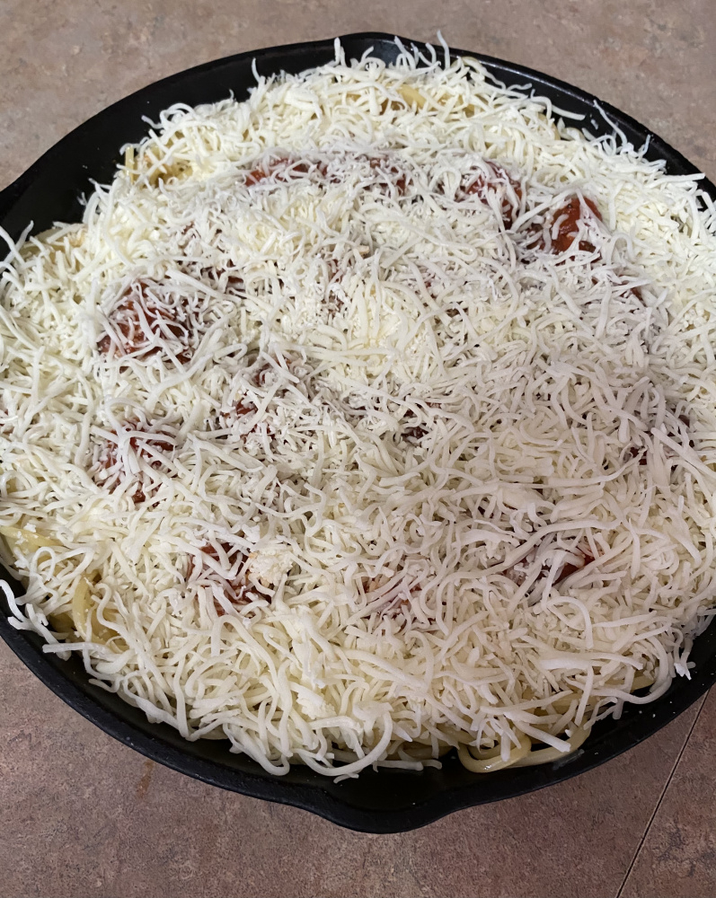 While the meatballs were cooking I made some spaghetti and mixed in some eggs, butter and parm to act as a binder to create a pasta crust.  Then into the Ci skillet