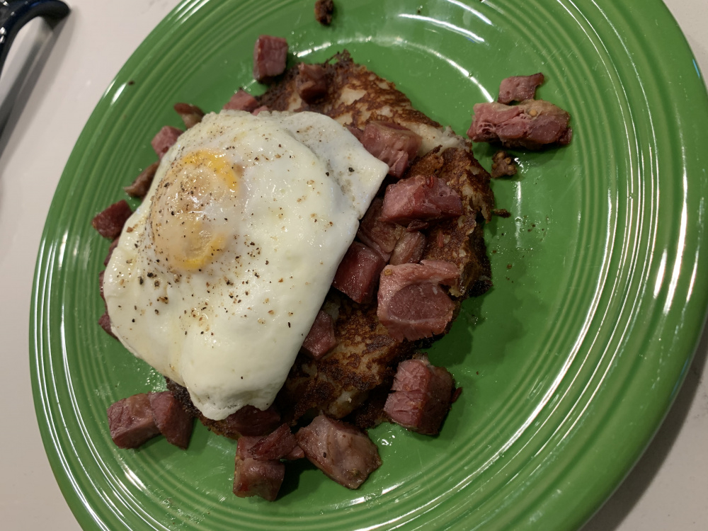 With our leftovers I sometimes like to change up the flavor. With corned beef I might chop it fairly fine, cook some of my par-cooked diced potatoes that I keep in the freezer, add some heat, salt, garlic, onion, cumin and cilantro, then at the very end, add the chopped beef.