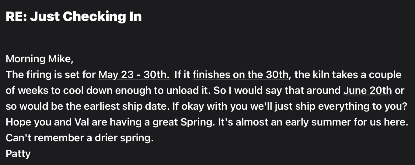Same, the finish on the whale kiln is worth waiting for.THANK YOU FOR YOUR ATTENTION TO THIS MATTER