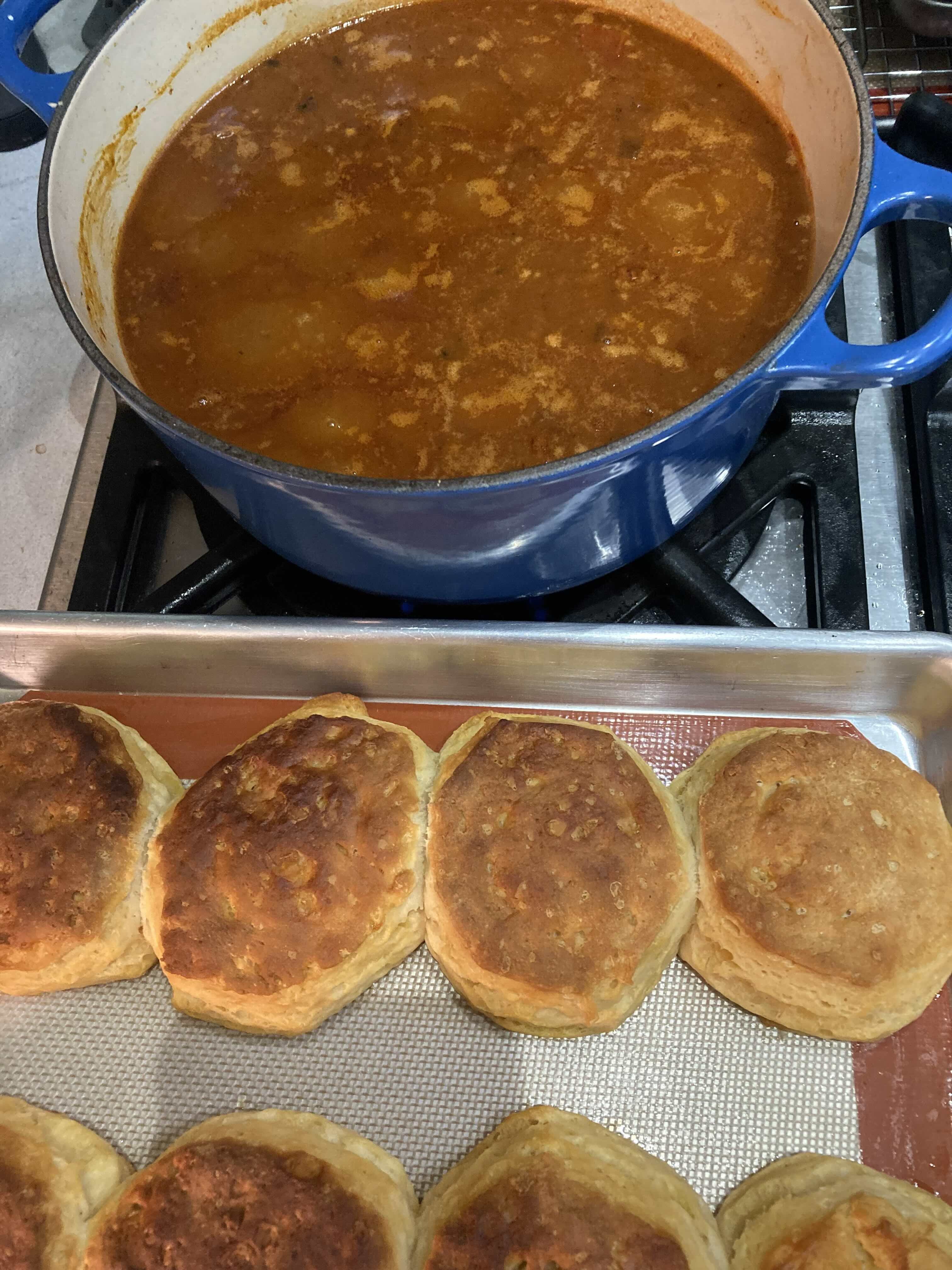 Had a cup of homemade red chile sauce left, it's cold outside, so Texas Red and cheesy biscuits out of a tube.  I stirred about a 1/4 cup of masa harina into it, which thickened it just right but tasted a bit stale, time for a new bag.