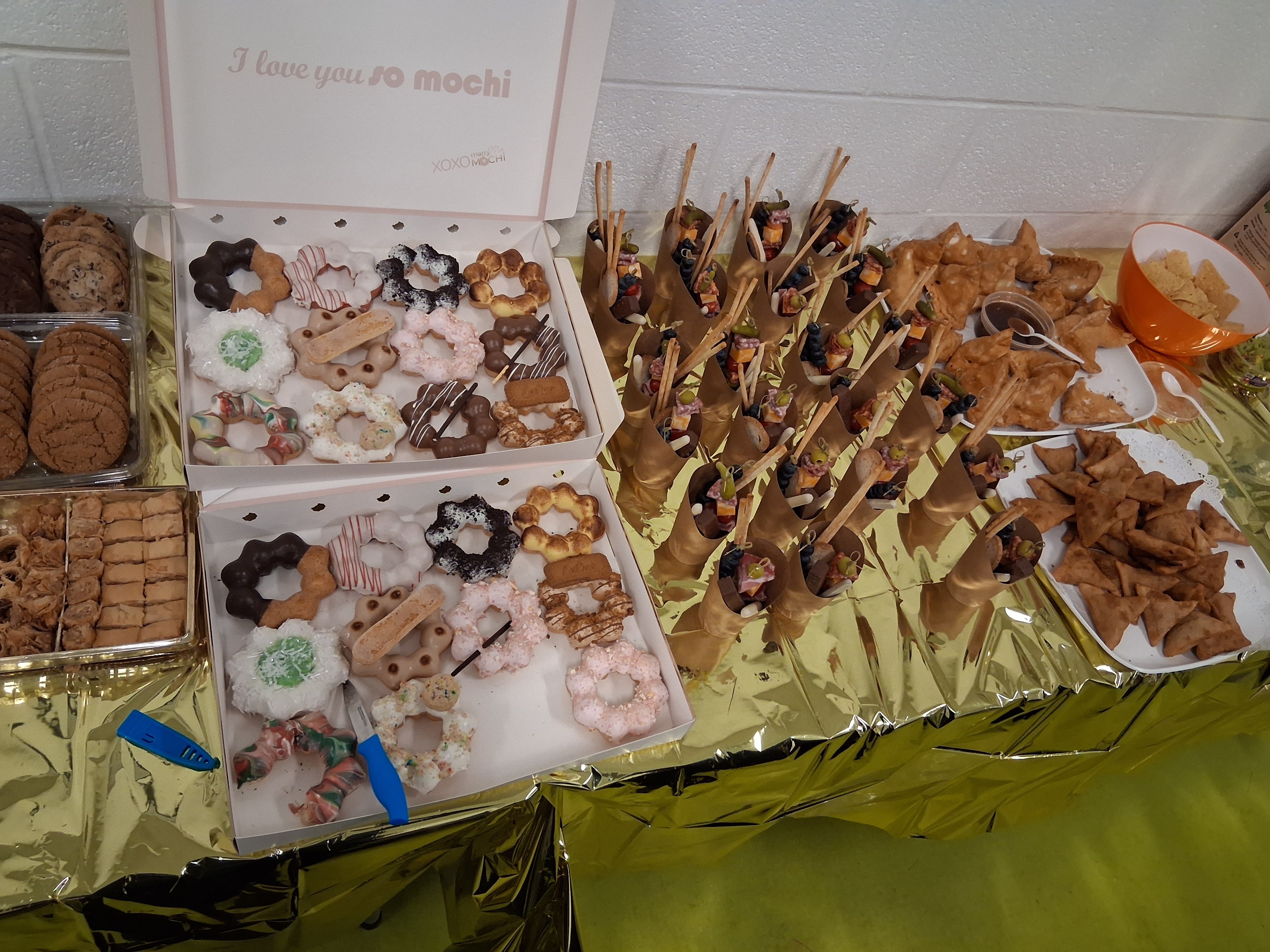Multicultural treats, left to right - cookies, baklava, #marrymemochi (mochi donuts inspired by Japanese flavours), #charcuterieinacup and samosas...