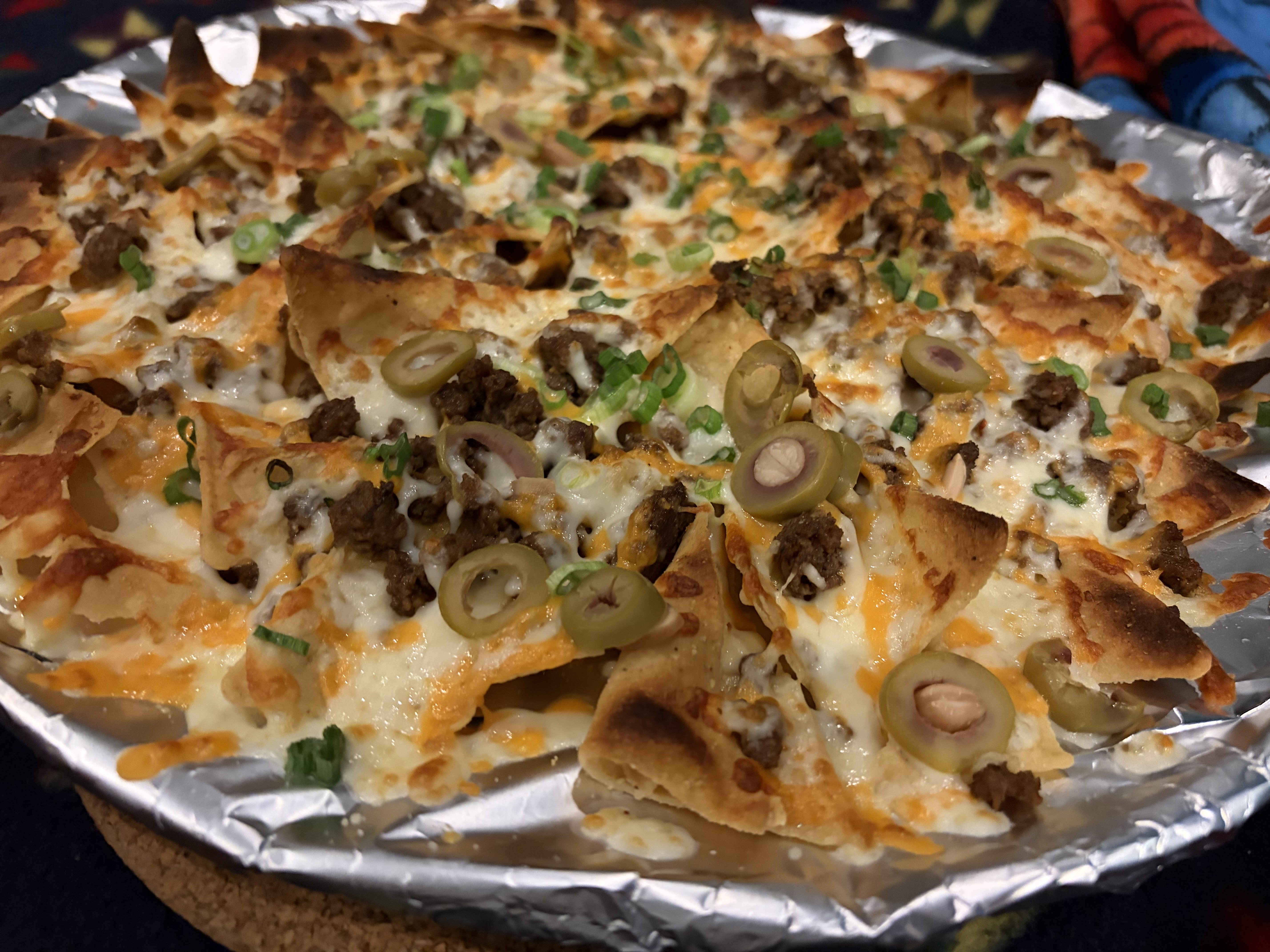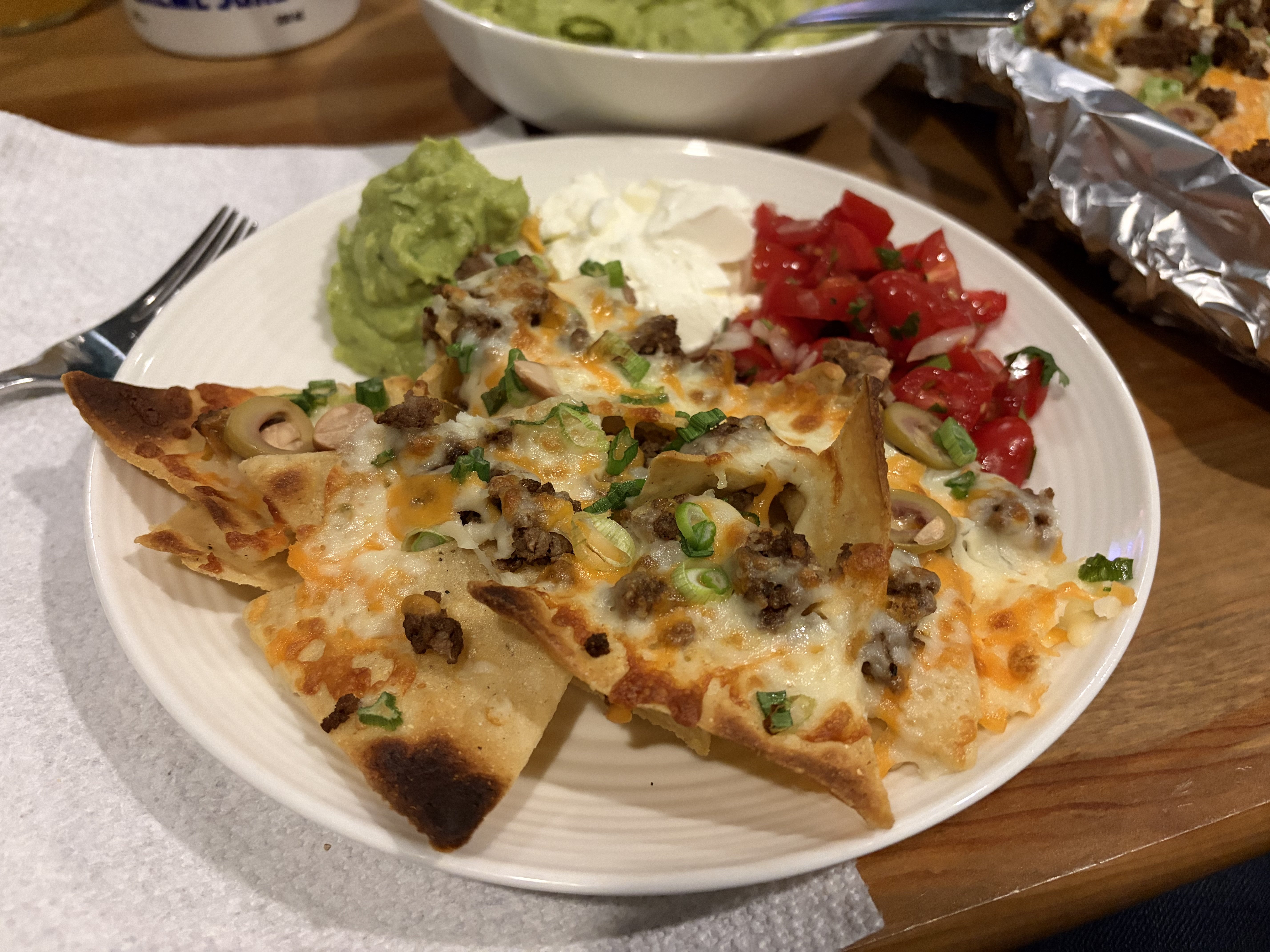 Nachos. Made with taco-seasoned lean ground beef and Tex-Mex cheese. Topped with green onions. Served with sour cream and homemade pico de gallo as well as homemade guacamole (daughter handled on her own). Hit the spot on a very, very snowy wintry evening.