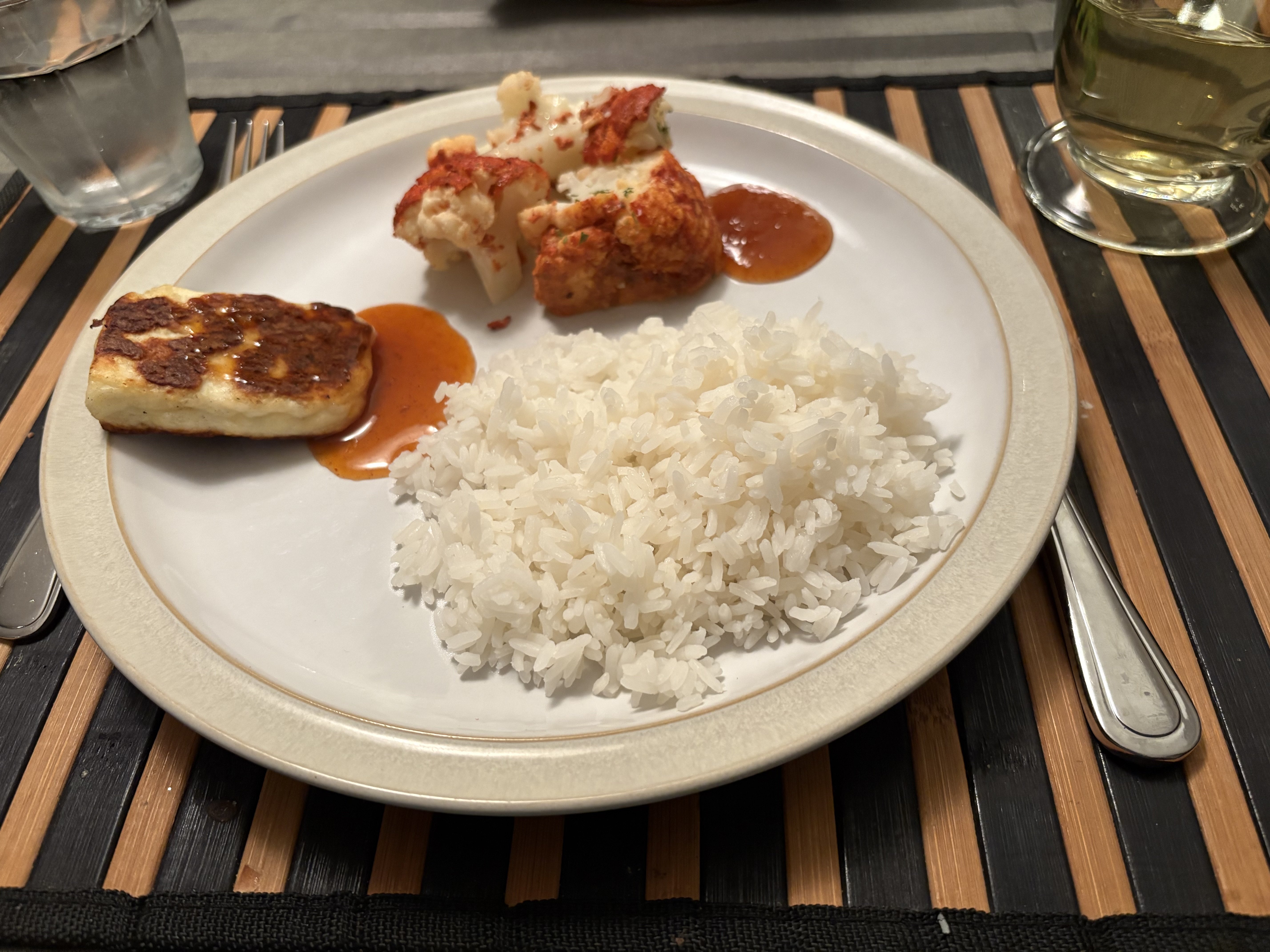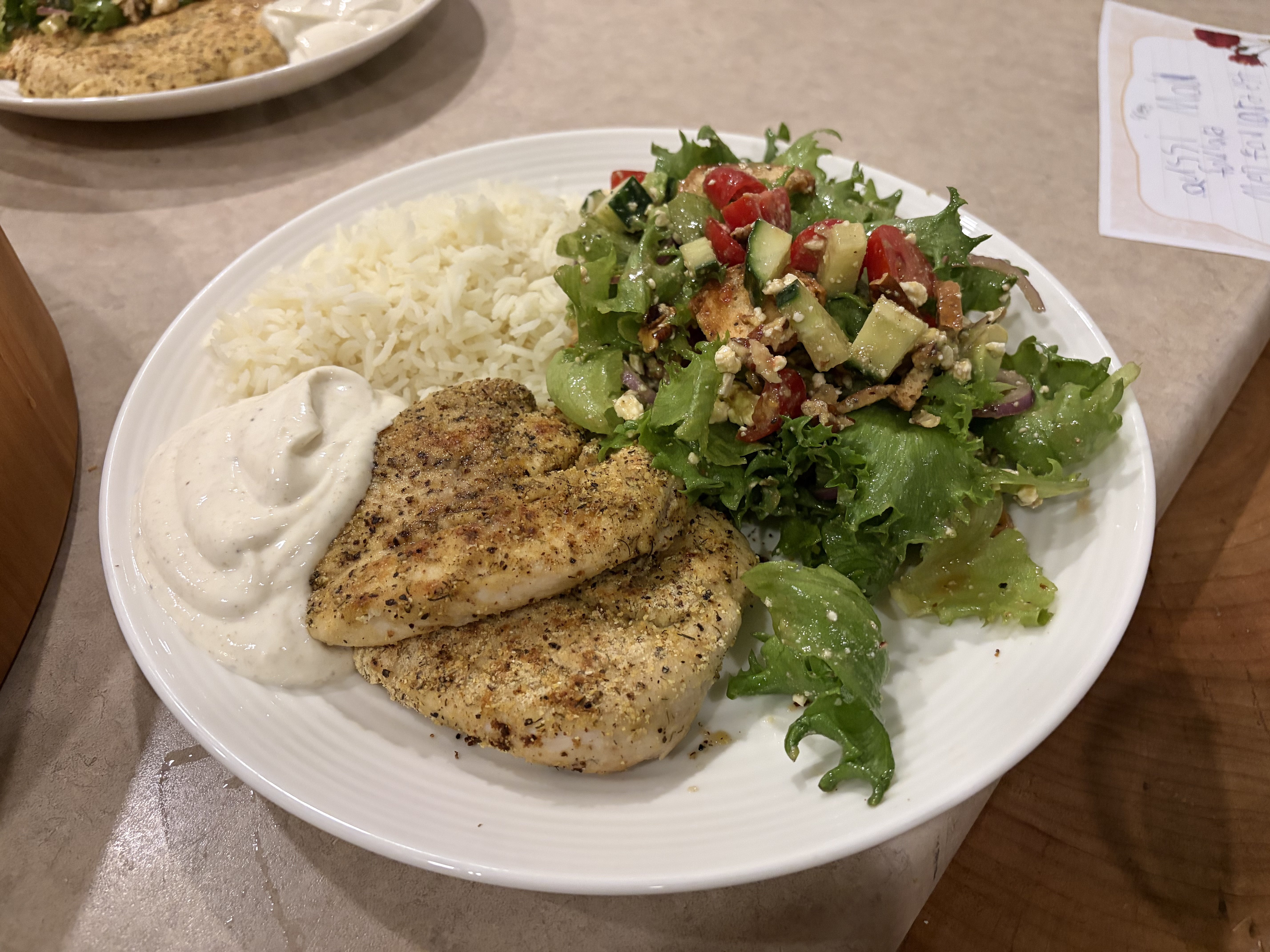 Lemon pepper pan fried chicken, Greek yoghurt, lemon and cumin sauce, white rice cooked in chicken-flavoured Better Than Bouillon, and a homemade salad with homemade dressing.