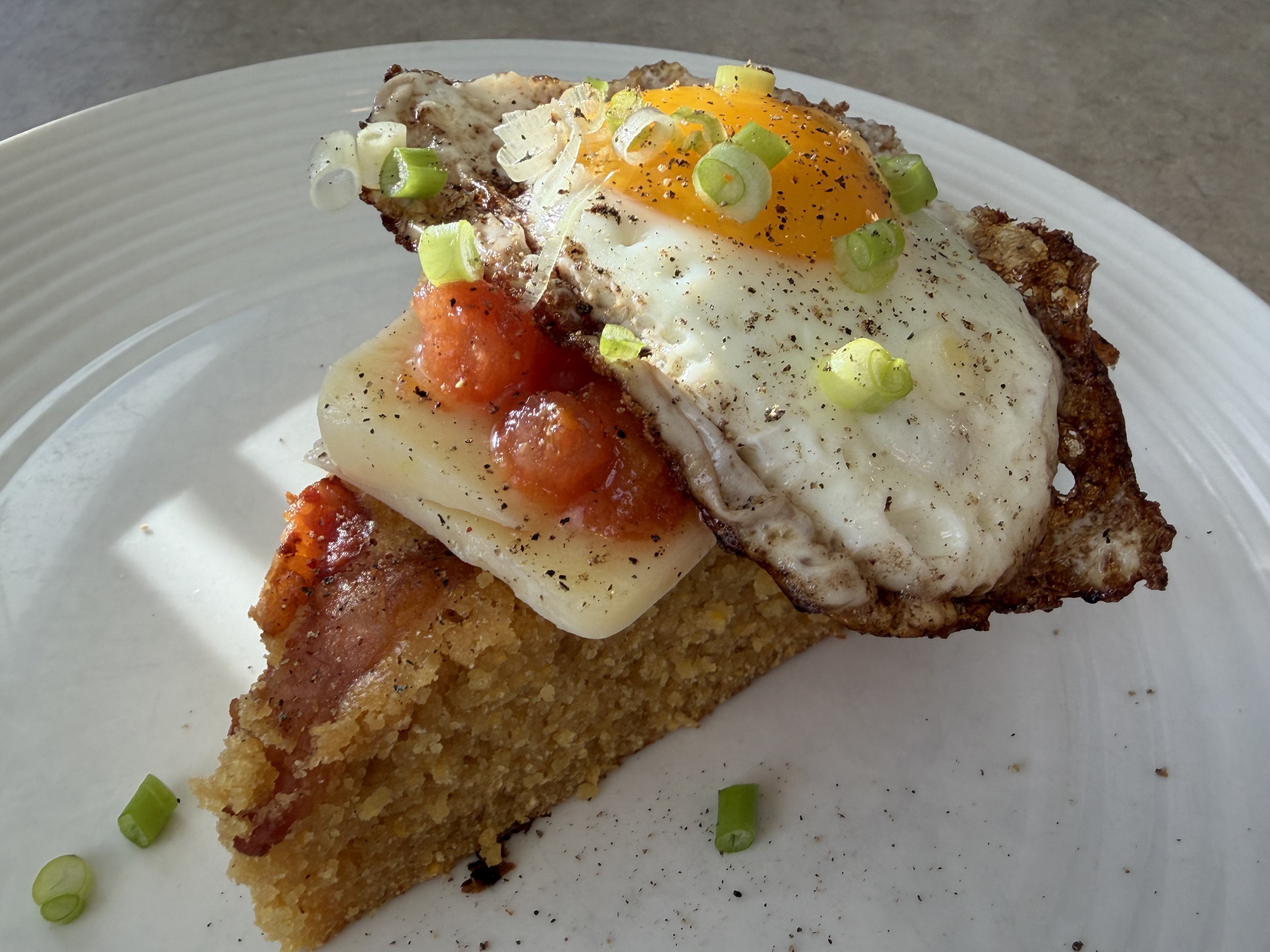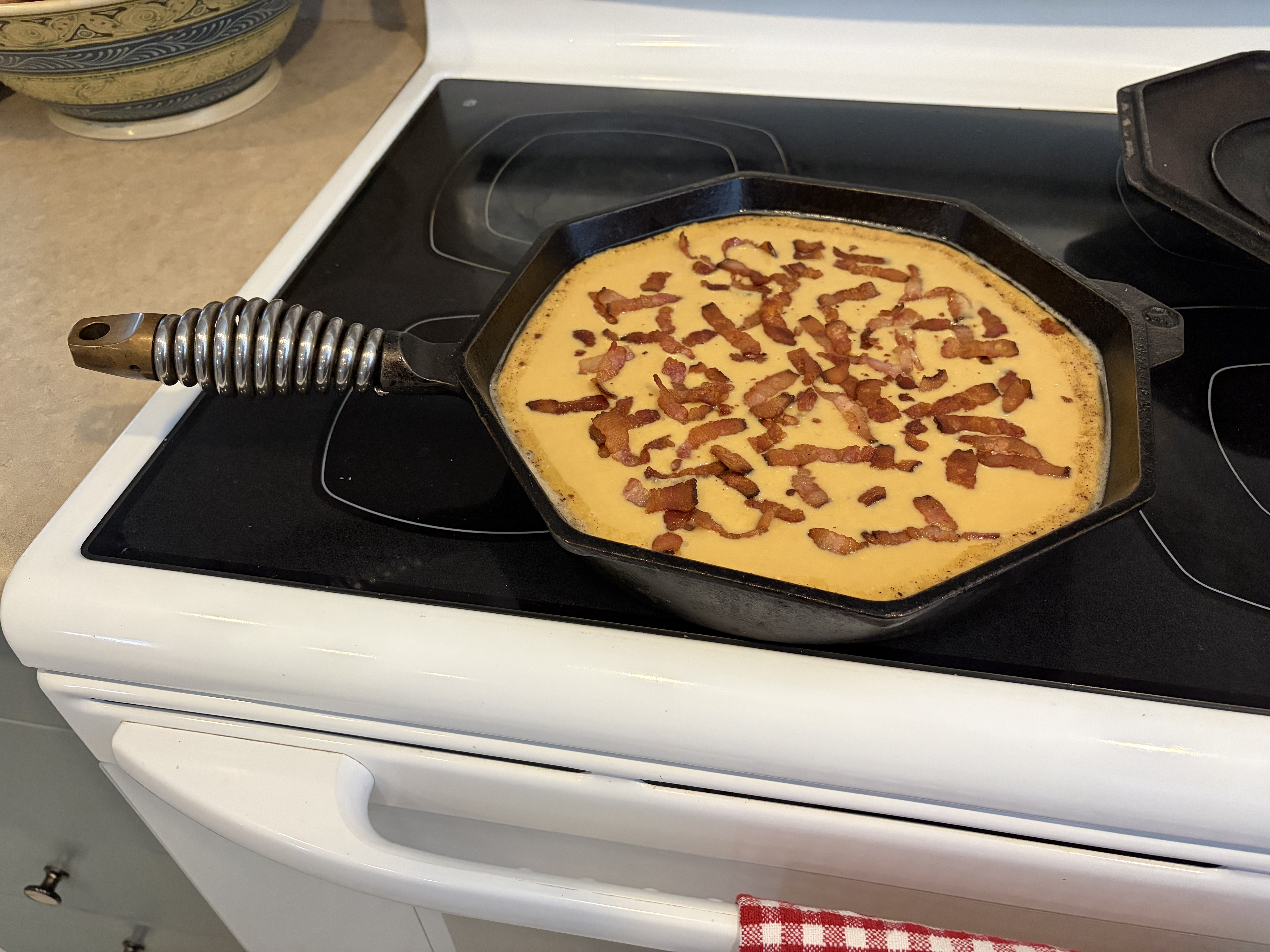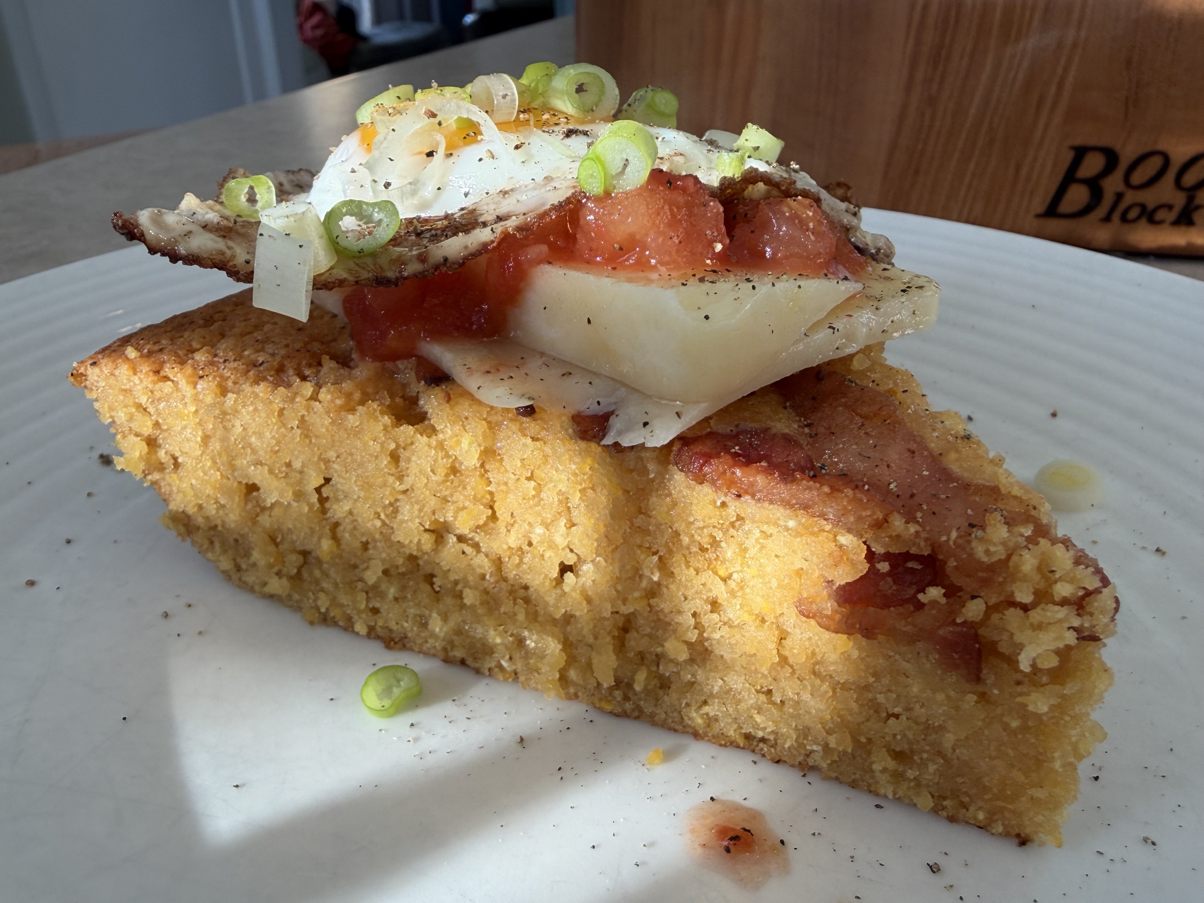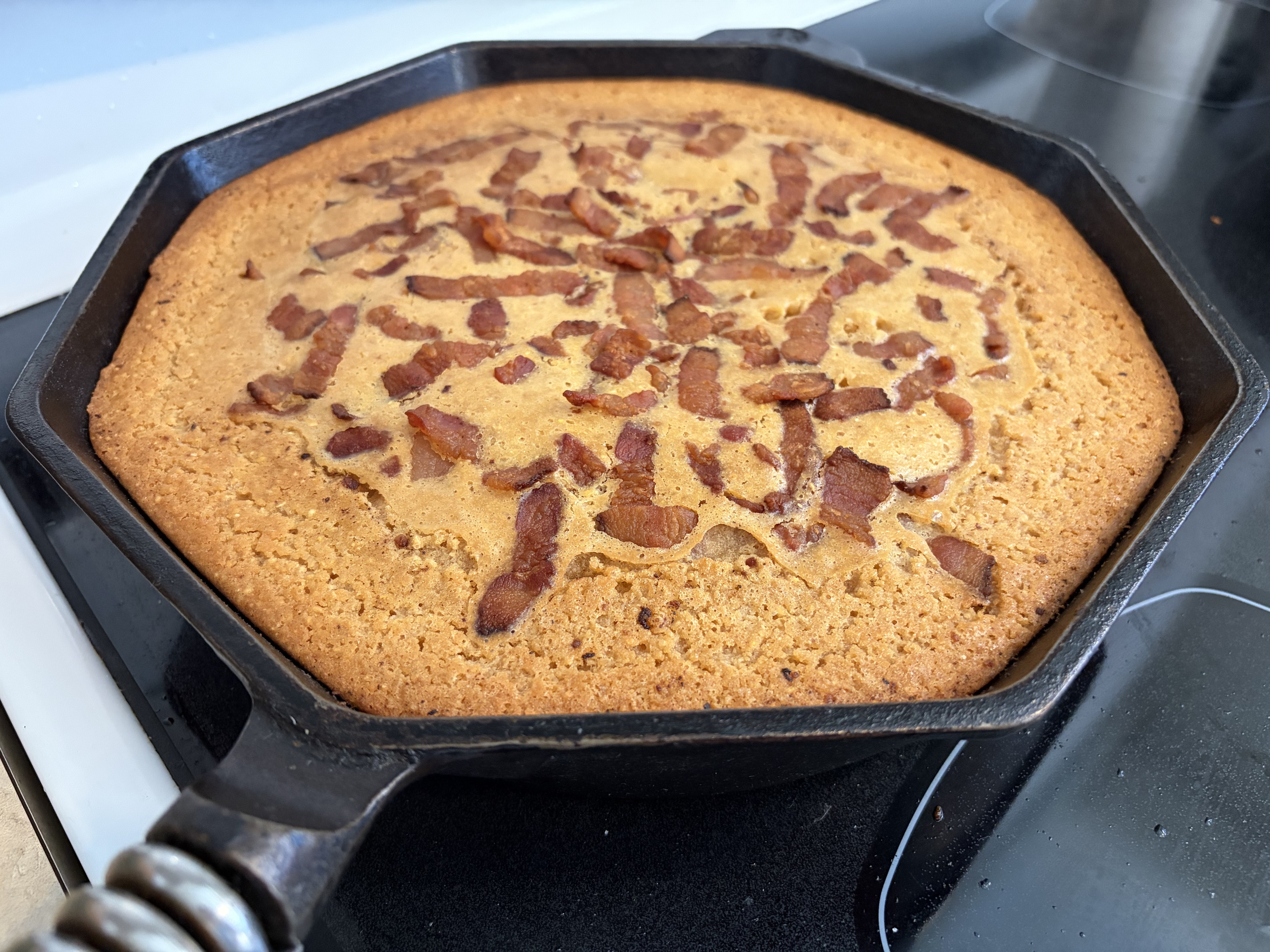 Because I was pouring the batter into a pan that was still hot from cooking the bacon before it hit the oven, I figured I’d pull on the low side of cornbread doneness (195-209F). Took it out at 190 to account for some carryover.