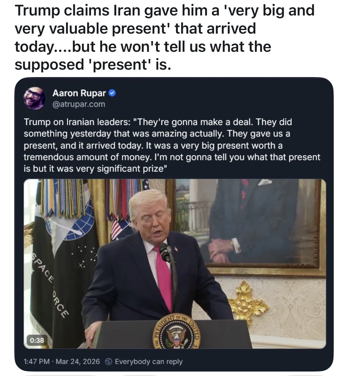 As more US troops head to the Middle East, President Donald Trump has increasingly looked for an off ramp for the war. Trump signaled that Iran had offered a “present” as a show of good faith in negotiations, and while he wouldn’t detail the gift, he confirmed it was related to energy flows through the Strait of Hormuz. Overall, there remained broad uncertainty about who the US is negotiating with, the structure of talks, and the outlines of any potential agreement, and Iran and Israel showed no signs of letting up in the conflict.
